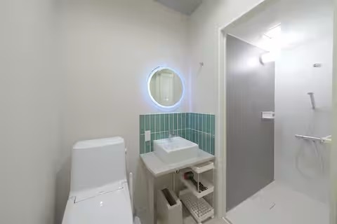 シャワーブース2、洗面台、独立トイレ3。16名で滞在しても、朝の支度に余裕のある動線。