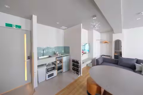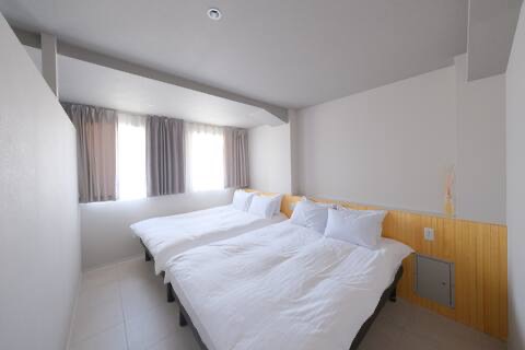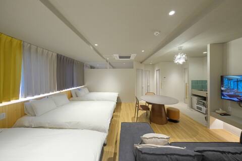 나무 바닥, 하얀 벽, 부드럽게 스며드는 빛. 두 개의 침실, 넓은 거실·다이닝, 그리고 충분히 갖추어진 주방을 포함한 85㎡의 공간. 최대 16명까지 가족이나 친구들과 함께 머무를 수 있는 오사카의 프라이빗 레지던스.