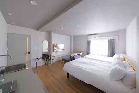 Suelos de madera, paredes blancas y una luz suave y difusa. Ochenta y cinco metros cuadrados que albergan dos dormitorios, un amplio salón-comedor y una cocina completamente equipada. Una residencia privada en Osaka, con capacidad para hasta dieciséis huéspedes — un remanso sereno para familia y amigos.