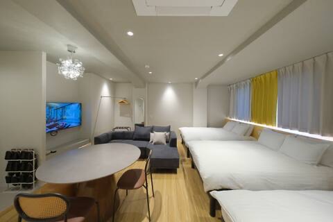 Parquet de bois, murs blancs, lumière douce et diffuse. Quatre-vingt-cinq mètres carrés comprenant deux chambres, un vaste salon-salle à manger et une cuisine entièrement équipée. Une résidence privée à Osaka, pouvant accueillir jusqu'à seize personnes — un refuge paisible pour la famille et les amis.