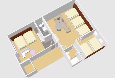 La plus grande pièce, combinant plusieurs lits et un espace de vie ouvert. Le cœur de la résidence, où se rassemblent famille et amis.